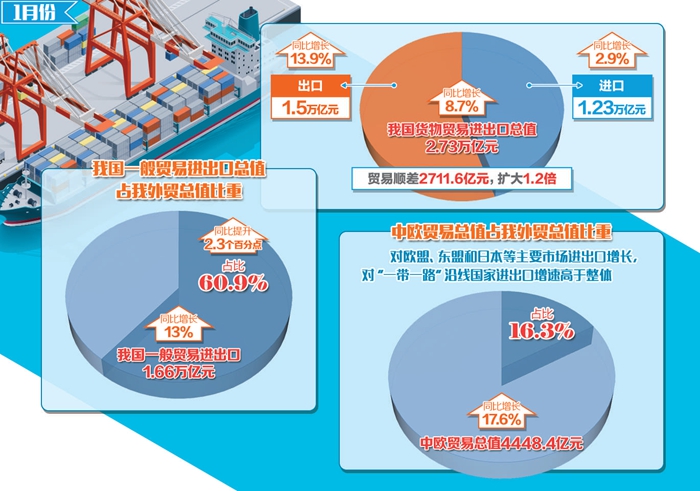 海关总署2月14日发布的数据显示,1月份我国货物贸易进出口总值2.73万亿元人民币,比去年同期(下同)增长8.7%。其中,出口1.5万亿元,增长13.9%;进口1.23万亿元,增长2.9%;贸易顺差2711.6亿元,扩大1.2倍。
