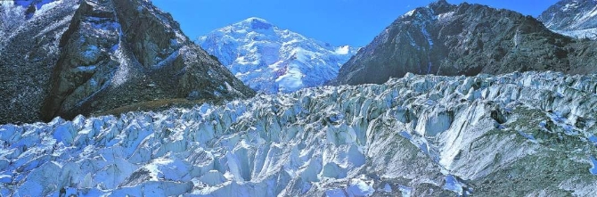 新疆众多的高山、雪峰,孕育了许多奇美的山岳形冰川。在《极限秘境》一书中,展示了郝沛拍摄的著名的迦舒布鲁姆冰川。它发源于喀喇昆仑山两座海拔8000米以上的山峰——布洛阿特峰和迦舒布鲁姆二峰。深山之中的冰川犹如镶嵌在巨石间的宝石,碧绿晶莹。一片片的冰塔林像一艘艘扬帆远航的巨轮或小船,在冰雪的海洋中破浪远行。群山环抱之间,这条绵延10公里的冰川闪烁着冰蓝的光芒,壮观而梦幻。