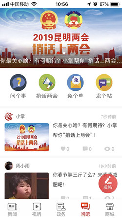 1.点击“掌上春城”App下方菜单中的“问吧”版块,在头图位置点击“捎话上两会”进入。