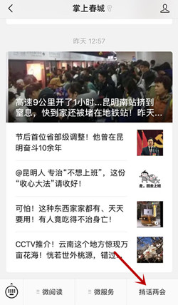 2.关注“掌上春城”微信公众号(kmzscc),点击右下方菜单中的“捎话上两会”进入;