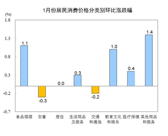 1月份,食品烟酒价格环比上涨1.1%,影响CPI上涨约0.34个百分点。其中,鲜菜价格上涨9.1%,影响CPI上涨约0.22个百分点;鲜果价格上涨2.3%,影响CPI上涨约0.04个百分点;水产品价格上涨2.0%,影响CPI上涨约0.04个百分点;禽肉类价格上涨0.5%,影响CPI上涨约0.01个百分点;畜肉类价格下降0.1%(猪肉价格下降1.0%,影响CPI下降约0.03个百分点)。