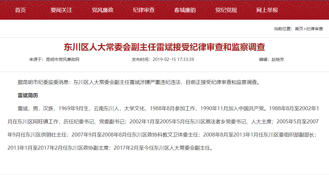 6686体育讯 2月15日,记者从昆明市纪委监委网站获悉,东川区人大常委会副主任雷斌涉嫌严重违纪违法,目前正接受纪律审查和监察调查。