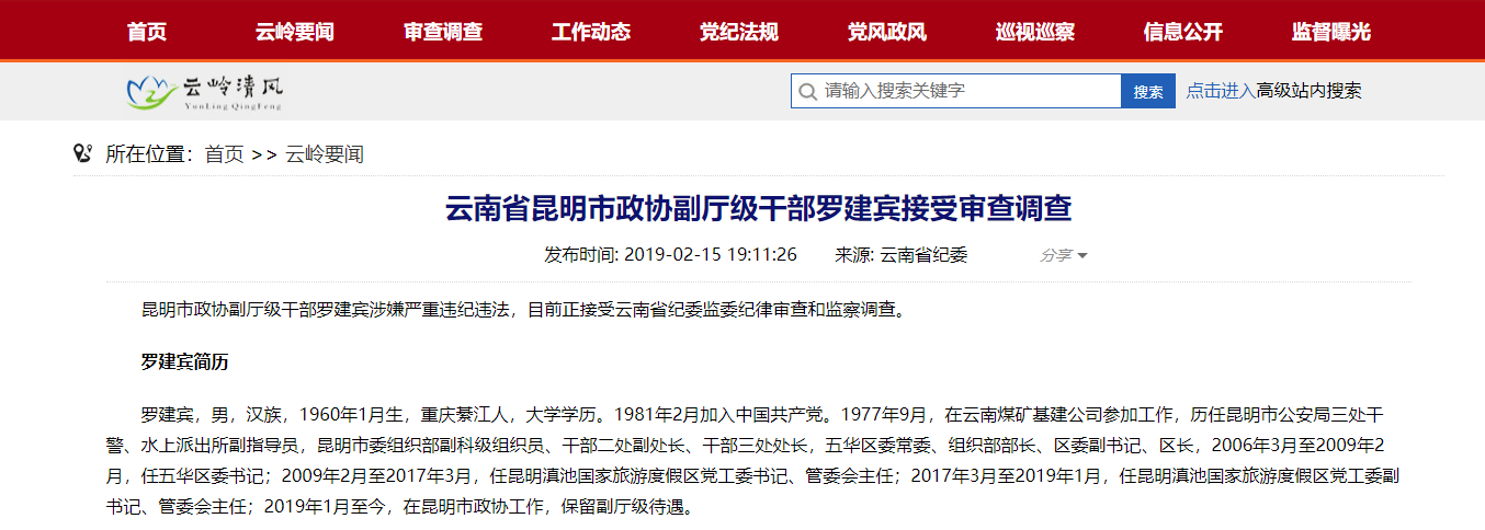 6686体育讯 2月15日,云南省纪委监委网站消息:昆明市政协副厅级干部罗建宾涉嫌严重违纪违法,目前正接受云南省纪委监委纪律审查和监察调查。