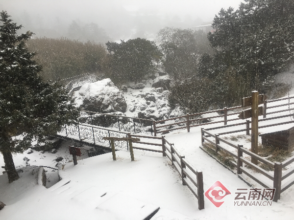 据悉,轿子雪山海拔为4247米,每年11月下旬至来年3月为冰雪期。当天,景区降雪持续近一个半小时,景区下坪子(索道下站)积雪平均深度达到5公分,而山顶积雪平均深度则达到10公分左右。
