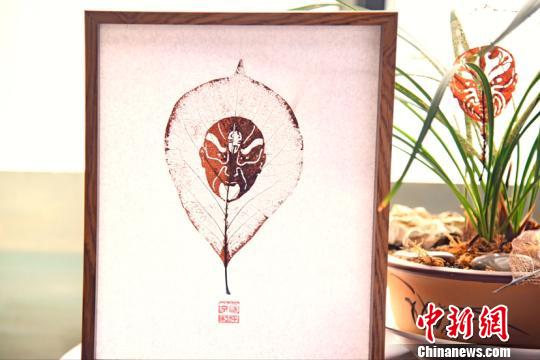 树叶上雕刻的京剧脸谱。王波/供图