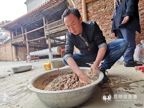 一位村民在大香底部涂抹香面。