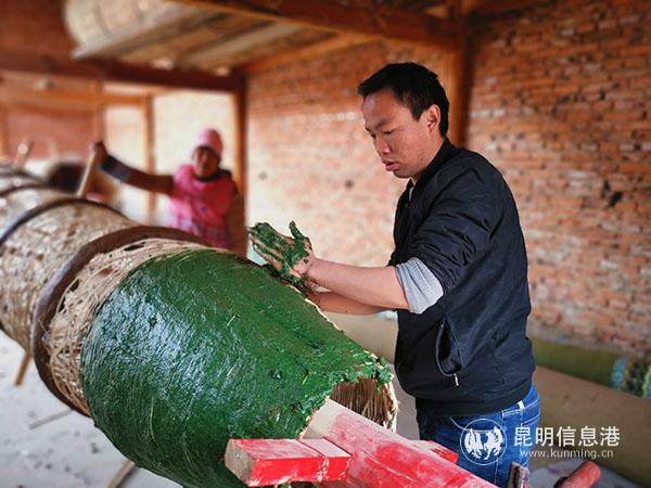 一位村民在模型上绘制十八罗汉图案。