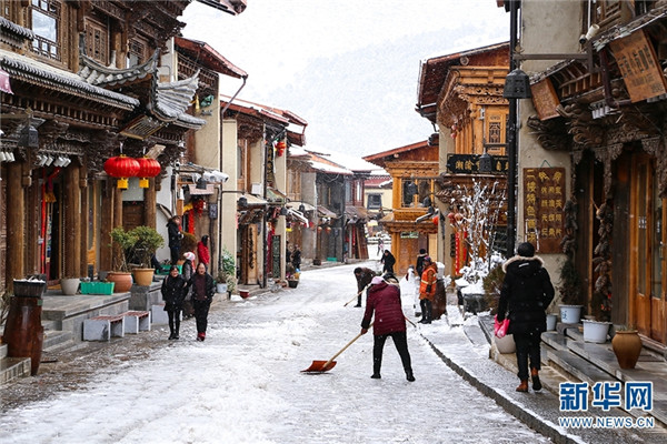 2月17日,云南香格里拉迎来降雪,雪花纷纷扬扬,将山川、林木、民居、道路等都裹上了一层洁白的“衣裳”,静谧而美丽。新华网发 崔永江/摄