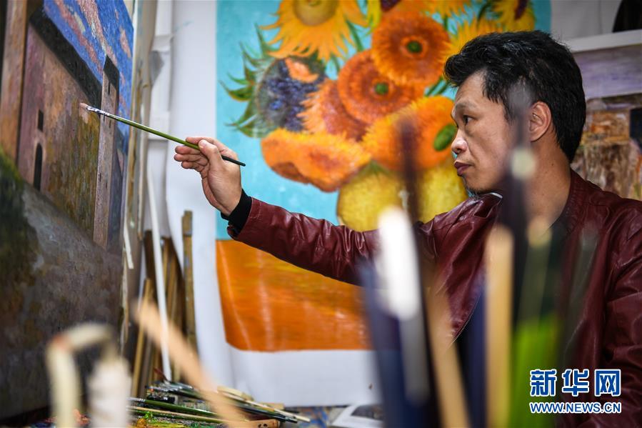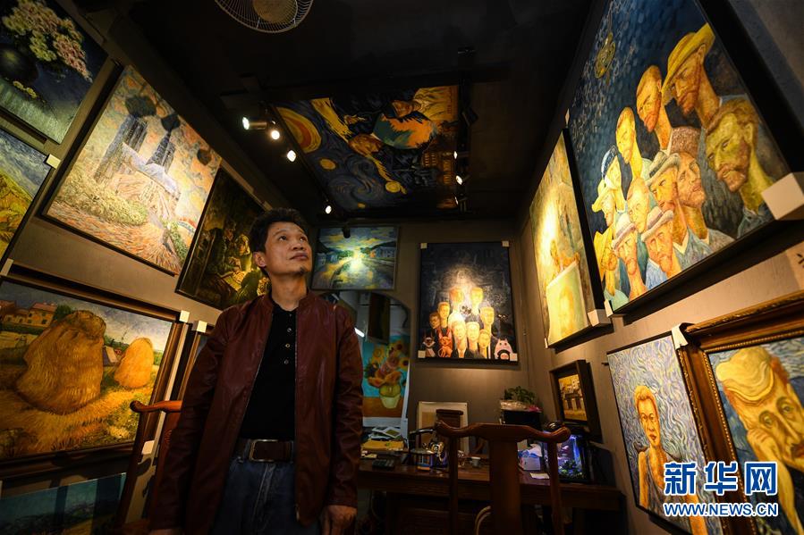 画师赵小勇在大芬村的画室里,周围都是他的作品,一半是临摹梵高的作品,一半是自己的原创作品(1月11日摄)。 新华社记者毛思倩/摄