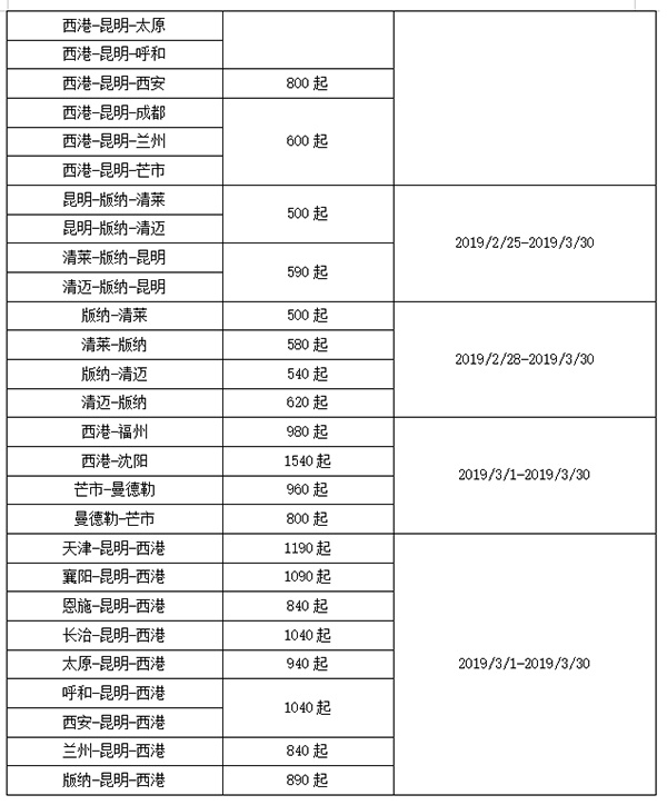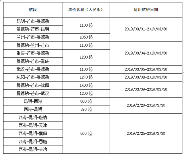 进入2019年,瑞丽航空持续安全稳健发展, 为了回馈广大旅客,瑞丽航空推出国际联程和直飞的优惠特价,西哈努克港出发经昆明飞往天津、襄阳、恩施、长治、太原单边含税最低600元起,昆明经版纳飞往清莱、清迈单边含税最低500元起。而西港直飞昆明最低只要370元。更多航线优惠机票详情如下: