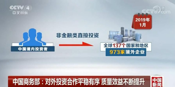 商务部发言人 高峰:除了一些国际机构预测今年全球经济增长可能放缓的预期,一些国家和地区加严对外国投资的安全审查等因素,也存在偶然性因素。从总体来看,2019年1月,我国对外投资合作的规模虽然有所下降,但质量和效益不断提升。