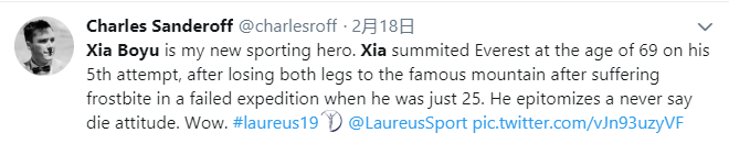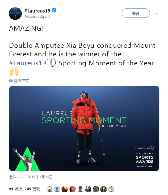 劳伦斯世界体育奖官方致辞称,在一年一度的劳伦斯世界体育奖“最佳体育时刻”公众投票中,励志的中国登山者夏伯渝获得了最多的选票。夏伯渝因他的不懈努力而受到表彰,经历了冻伤、截肢、癌症、血栓等众多挑战,他从未放弃与珠峰拥抱的梦想!过去四十年,他数次尝试登顶。终于,在去年,这一神圣的雪山接纳了他。这是 2019劳伦斯世界体育奖年度最佳体育时刻奖得主夏伯渝的故事,向世界展示着中国人的坚毅和信念!