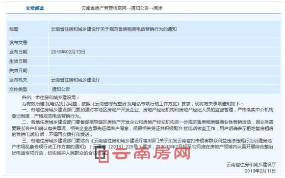 按照云南省住房和城乡建设厅公布的关于规范售房租房电话营销行为的通知,自今年2月起至12月底,各地住房城乡建设部门在房地产领域认真开展综合整治骚扰电话专项行动,严格规范电话营销行为。各地住房城乡建设部门要督促指导辖区房地产开发企业和房地产经纪机构进一步规范售房租房等商业性营销活动,因业务需要联系客户和确认有关事项,相关企业应事先征得客户同意,保留相关凭证并积极配合骚扰电话核查工作,用户明确表示拒绝售房租房的营销电话后,不得再次拨打和发送。