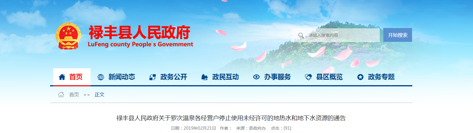 禄丰县人民政府关于罗次温泉各经营户停止使用未经许可的地热水和地下水资源的通告