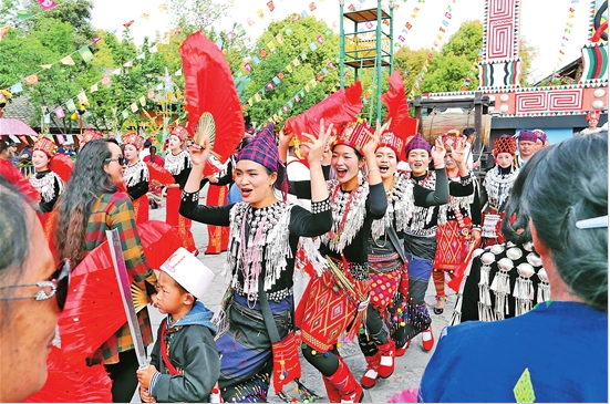 “快快!我要拍‘抖音’。”2月23日一早,河南游客崔倩和家人来到云南民族村,被这里的目瑙纵歌节活动吸引。当天,以“目瑙纵歌·盛世欢乐”为主题的云南民族村2019中国·昆明景颇族目瑙纵歌节开启欢乐大幕。