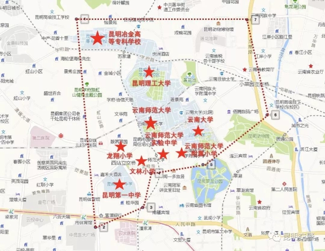 学府路片区:该片区包括昆明冶金高等专科学校、昆明理工大学、云南师范大学、云南大学、云南师范大学实验中学、龙翔小学、文林小学、云南师范大学附属小学及昆明第一中学。
