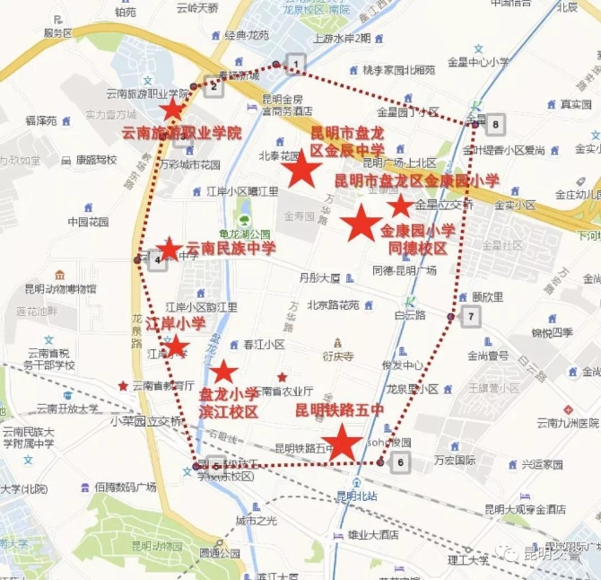 云南民族中学片区:该片区包含云南旅游职业学院、云南民族中学、江岸小学、盘龙小学滨江校区、昆明铁路五中、金康园小学同德校区及金辰中学。