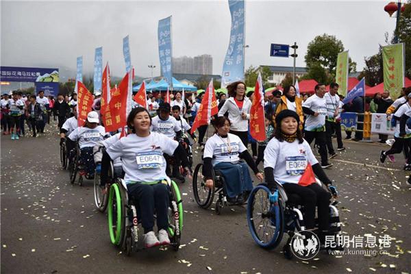 而来自全国的轮椅选手也成为了本次马拉松赛的一大亮点,14名轮椅选手组成的“滚遍中国无障碍公益跑团”,其中5人参加半程马拉松,9人参加五公里欢乐跑,整个团队还拒绝了组委会的特殊安排。队长权鹏表示,“我们以‘滚动中国’为主题,以自力的方式在全国宣传残障人士也能像普通人一样,这次专门来到罗平参加马拉松,就是要让人们看到,我们通过自己的双手摇动轮椅也能参加马拉松运动, 也要像普通人一样欣赏罗平的万亩油菜花。”