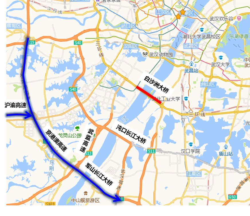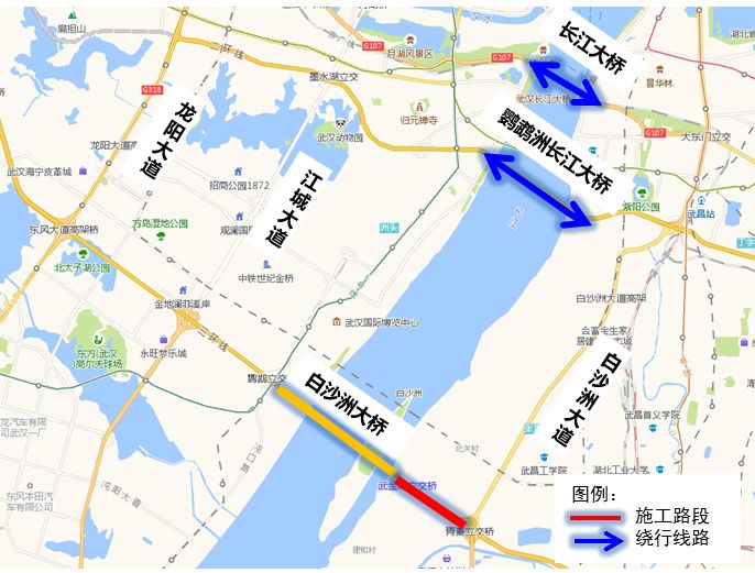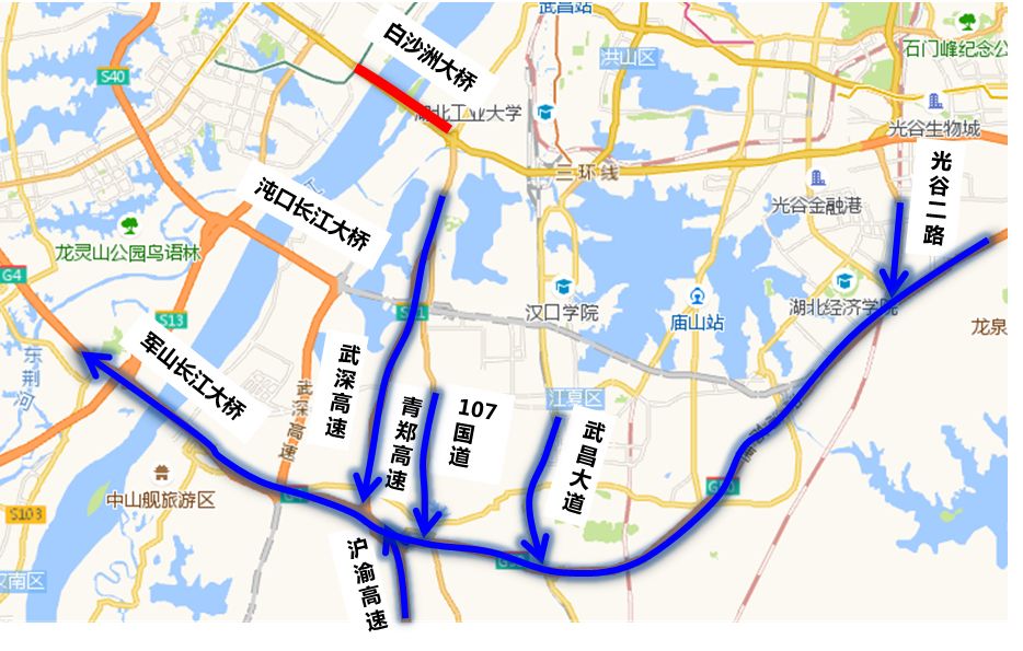 白沙洲方向车辆可通过白沙洲大道、青郑高速武昌收费站进入青郑高速,经青郑高速、武汉绕城高速(京港澳高速)绕行军山长江大桥。