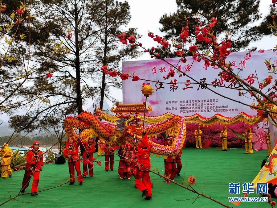 当日,广西环江毛南族自治县桃花节开幕,当地居民及游客相聚环江八戒山公园,在桃花的芬芳中观看舞龙舞狮及文艺表演,欢庆春天的到来。 新华社发(高东风/摄)