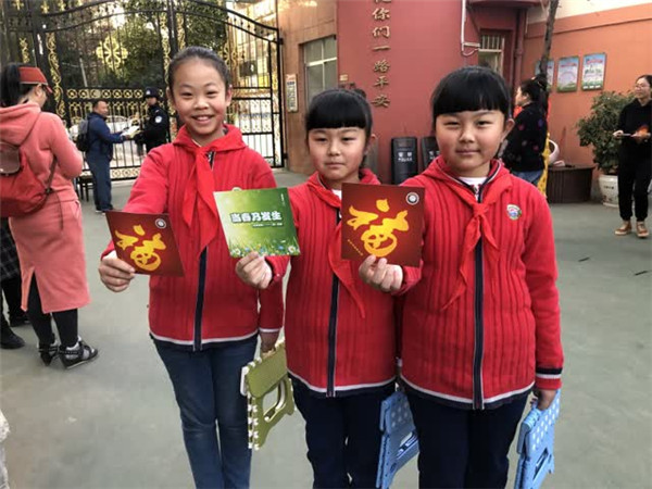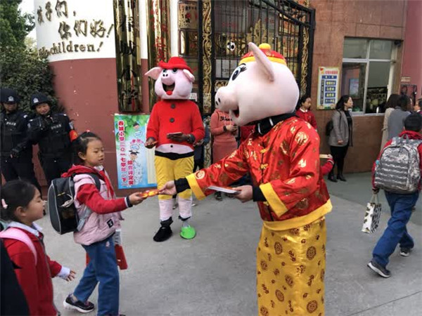 早晨7点多,五华区春城小学门口就有3名老师穿上了猪年卡通人偶服。开学第一天,身穿人偶服的老师为每一名走进校园的学生送上了福卡,福卡背后写有与春天有关的诗词。四年级女生朱亭鸳收到福卡后很激动,福卡上的诗句来自古诗《春晓》,她很喜欢学校的这份开学礼物,“收到福卡我们都特别惊喜,新学期也要更努力学习。”