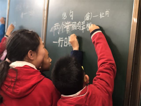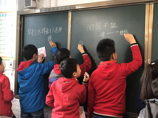 在四年级3班的教室里,学生们就将福卡上的诗句进行了拼凑,并将拼好的古诗抄写在黑板上,全班同学一起吟诵。开学典礼上,学校还举行了诗词大会。春城小学通过抽签的形式,让老师和各年级学生依次上台比拼与春天有关的诗词。通过“飞花令”的形式,角逐出2名选手进行抢答,现场氛围十分热烈。