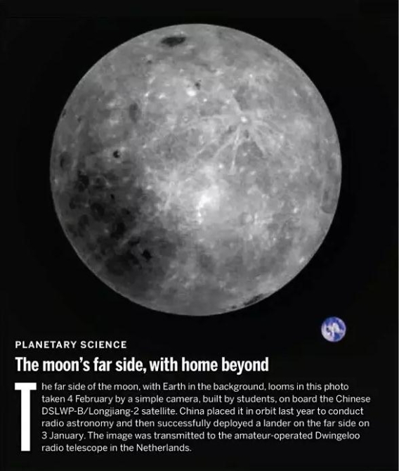 《科学》杂志上刊登的这张照片角度很别致,正如英国的Science Post网站在文章中称,中国的龙江二号卫星最近拍摄了一张独特的照片,镜头聚焦在月球背面,而地球被置于背景中。从这个不寻常的角度来看,地球显得出奇地小。