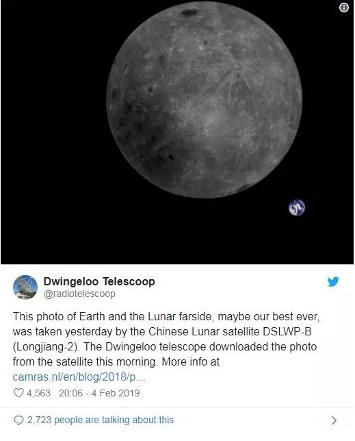 位于荷兰的射电天文台Dwingeloo Radio Telescoop在其推特账号上发文称,“这张地球和月球背面的照片,或许是迄今为止最好的一张”。