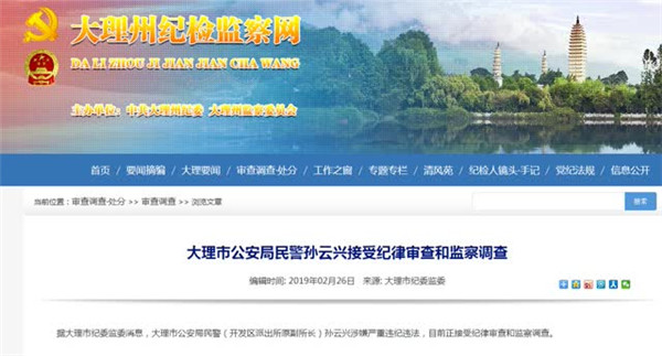 据大理市纪委监委消息,大理市公安局民警(开发区派出所原副所长)孙云兴涉嫌严重违纪违法,目前正接受纪律审查和监察调查。