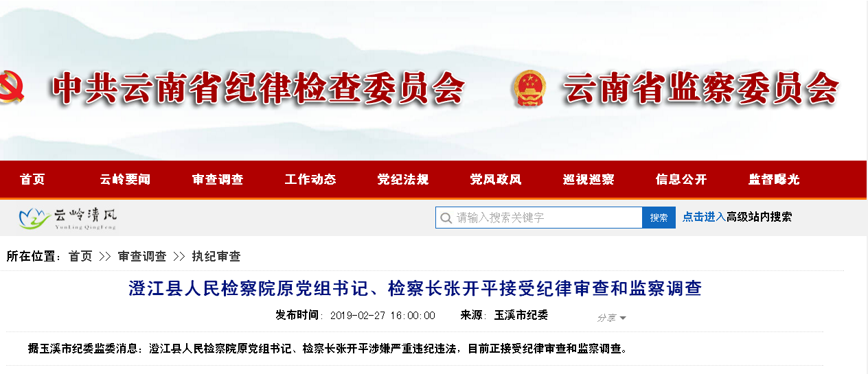 6686体育讯 2月27日,据玉溪市纪委监委的消息,澄江县人民检察院原党组书记、检察长张开平涉嫌严重违纪违法,目前正接受纪律审查和监察调查。