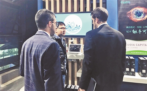 外国嘉宾在展会上观看第四范式的人工智能解决方案。 (资料图片)
