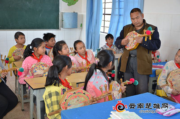 近年来,禄丰县中村乡重视传统非遗文化传承保护工作,乡党委政府、文化部门及学校充分认识传承民族非遗文化从学生娃娃抓起理念,从小培养小学生的爱好兴趣,分别在峨山小学开办彝绣班、叽拉小学开办彝族少儿小月琴班,使非遗文化传承工作做到后继有人 。图为叽拉小学彝族教师为小学生上弹奏小月琴课。 丁向阳 摄