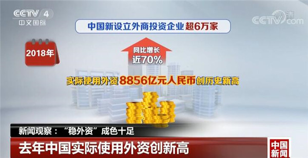 2018年,中国新设立外商投资企业超6万家,同比增长近70%,实际使用外资8856亿元人民币,创历史新高。