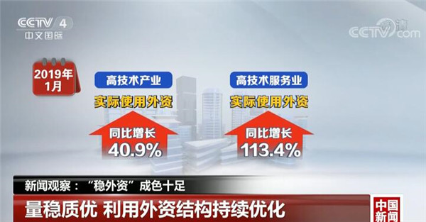 不仅“量稳”,外商投资更是“质优”,2018年,高技术制造业利用外资增长35.1%。进入2019年,这一势头有增无减,最新数据显示,2019年1月,高技术产业实际使用外资同比增长40.9%,高技术服务业实际使用外资同比增长113.4%。