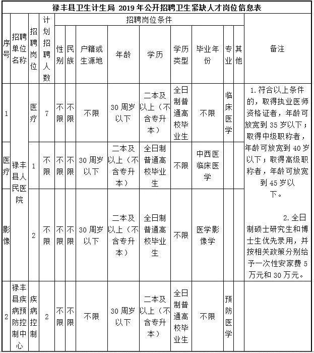附:禄丰县卫生计生局2019年公开招聘卫生紧缺人才岗位信息表
