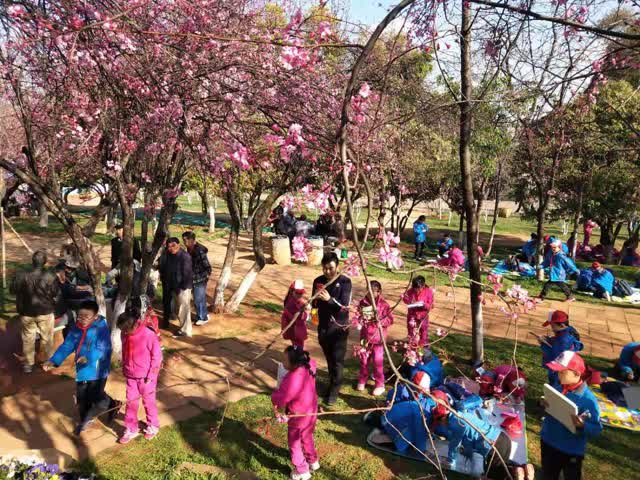 3月1日上午,在民族歌舞表演《欢天喜地》和杂技舞蹈《呼啦圈—弗拉明戈》的热烈表演中,昆明市第二十届樱花节暨云南省“圆通樱潮”第五届非物质文化遗产展拉开了序幕。随后,记者进入公园,发现海棠大道已是一片花海,今年的垂丝海棠已经盛开,一树树的花让这里的春光格外的夺目,而多数的樱花,打着的是累累的花苞,看上去也很快就要开了,目前只有少数几枝樱花,刚刚开放,看来还要过几天,樱花才会大片的开出来。美丽的海棠花开,吸引来众多游客,人们赏花拍花,很是快乐,还有上百的小朋友在海棠树下画花儿,他们十分的投入与认真,似乎想通过画笔和画纸,将春天带走。公园内真是花气人气都很旺。