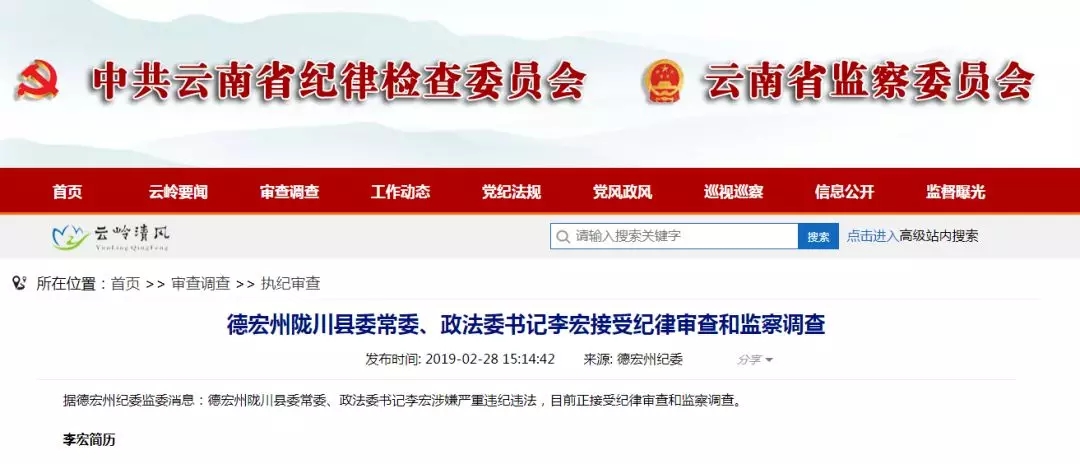 德宏州陇川县委常委、政法委书记李宏涉嫌严重违纪违法,目前正接受纪律审查和监察调查。
