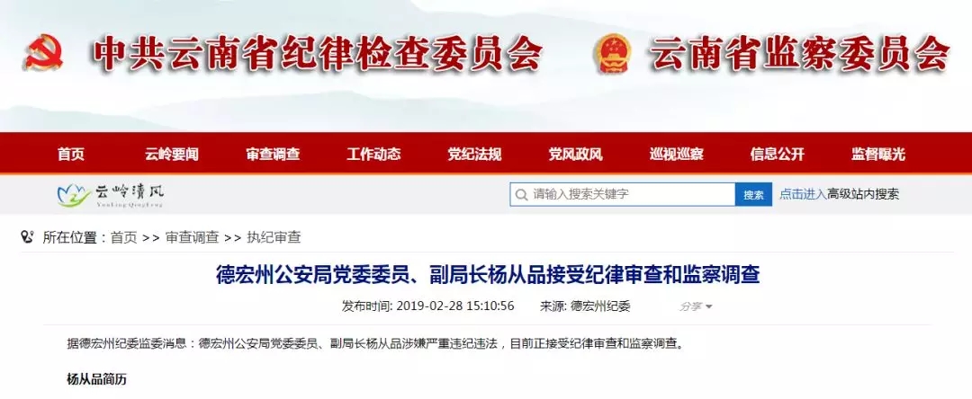 德宏州公安局党委委员、副局长杨从品涉嫌严重违纪违法,目前正接受纪律审查和监察调查。