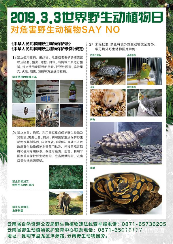 工作人员介绍,世界野生动植物日旨在倡议大家加强学习野生动植物保护知识,自觉保护野生动植物。同时,作为主办单位的云南省林业和草原局也向民众发出了倡议:不捕捉野生动物,不采集珍稀濒危野生植物,为野生动植物生存繁衍护航;不消费非法的野生动植物及其制品,树立绿色消费新风尚;不饲养野生动物作为宠物,维护个人和动物的健康;不随意放生野生动物,防范有害生物入侵和疫病传播;不点赞、不传播有关伤害、破坏野生动植物的信息,传递保护正能量。