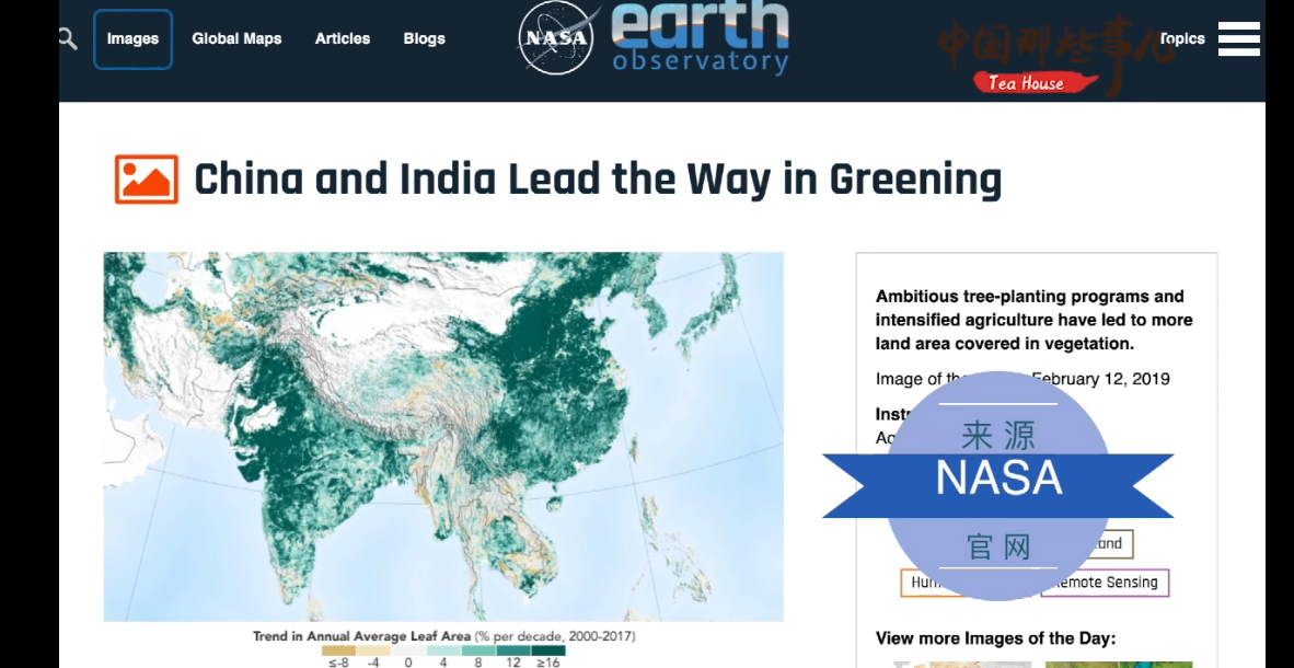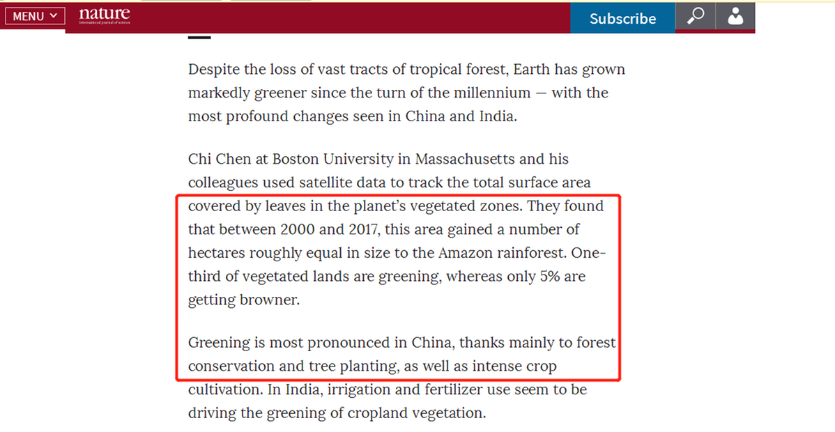 2019年2月11日,英国《自然》旗下期刊发表一份研究报告称,自世纪之交以来,地球的绿化程度正在提高。其中绿化在中国最为显著,这主要归功于森林保护和植树造林,以及集约化的农作物种植。随后,NASA也在网上发文介绍了这一研究发现。