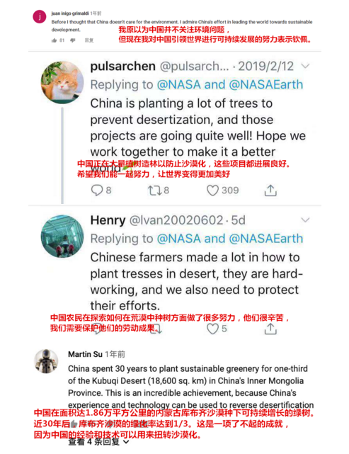 虽然在保护环境的举措上,我们没有进行过大规模的宣传,但中国在植树造林上的成就在全世界有目共睹。治沙的同时,中国还在积极寻求解决贫困的办法。2017年7月,美国《时代》周刊曾在网站上发布过一则介绍中国治理库布齐沙漠做法的视频,文章介绍称中国政府不仅在治沙的同时还实现了脱贫,堪称世界典范。事实上,无论是《自然》杂志给出的权威报告,还是NASA的充分肯定,都再次让全世界对中国刮目相看,国外网友更是毫不吝惜对中国的赞美。