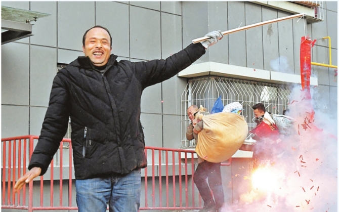 乌鲁木齐市民玉山·巴克和家人在爆竹声中搬入新家。 韩亮摄