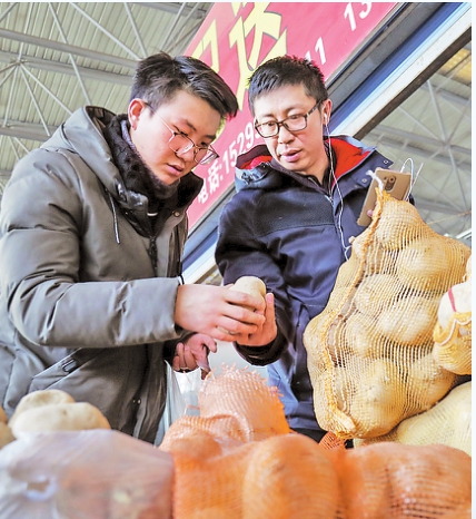 2月13日,孔繁斌(右)和同事在乌鲁木齐市新联农副产品综合市场选购蔬菜。从2018年6月开始,孔繁斌与合作伙伴开发的“鲜鲜到家”APP上线试运行,到目前为止,团队由最初的4人发展到目前的10人,业务不断拓展,用户近3000人。 谢龙摄