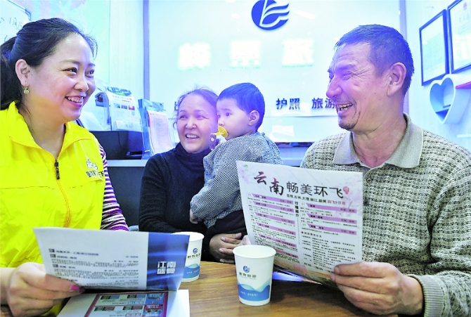 1月26日,乌鲁木齐市民马合木提·吾斯曼(右)和家人在旅行社咨询旅游事宜。马合木提说:“现在生活好了,家里也有了一些存款,我想带家人去内地旅游。” 韩亮摄