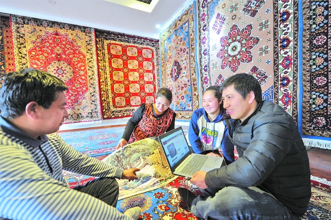2月2日,和田市吐沙拉镇格来木村村民在讨论地毯花色的设计。该村是远近闻名的“地毯村”,全村1400名村民中有700余名从事地毯加工业。2018年,全村地毯销售额达到5000余万元。 记者周鹏摄