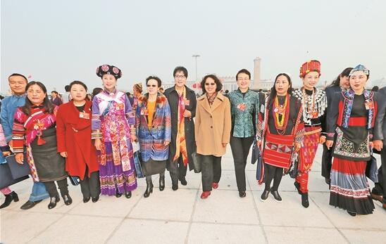 身着盛装的住滇全国政协委员走进人民大会堂。记者周灿/摄