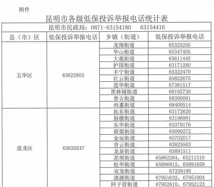 6686体育讯 记者周硕 为了杜绝“人情保”“关系保”和贪污侵占、截留挪用低保金等违法违纪问题,按照《云南省民政厅关于进一步严格规范管理推进阳光低保的若干规定》(下称《规定》)要求,昆明市现将各县区、乡镇街道的低保投诉电话进行公布,方便受理群众的咨询和投诉举报。