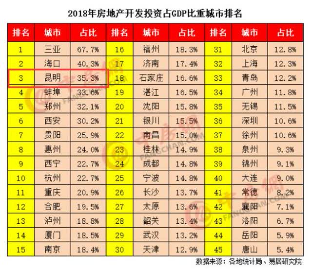 报告显示,在45个大中城市中,2018年云南房地产开发投资占GDP总量的18.2%,在全国排名第四;2018年房地产开发投资占GDP比重排名前三位的城市依次是三亚、海口和昆明,昆明市房地产开发投资占GDP比重为35.3%,排在第三位。易居研究院认为,三亚、海口和昆明的经济之所以对房地产的依赖度过高,主要是产业结构不合理造成的。其中,海南省政府已多次出台严厉调控政策,三亚对房地产的依赖正在逐渐下降,但房地产开发投资对于全市的经济贡献依然高达近七成。昆明的情况也非常相似,昆明市经济对房地产的高依赖度也持续了多年。