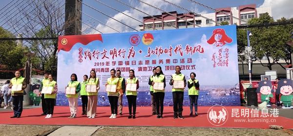 活动现场对盘龙区2018年学雷锋先进典型进行了表彰,并为14家共青团“团团营·滇池卫士”项目志愿服务队授旗。