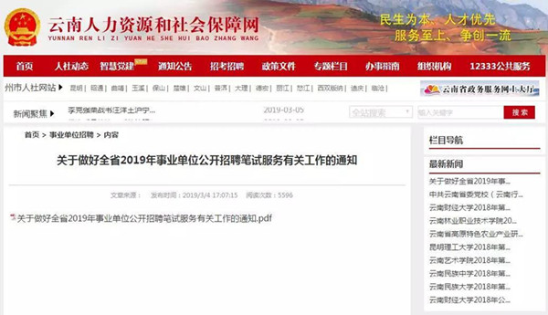 3月4日,云南人力资源和社会保障网发布《关于做好全省2019年事业单位公开招聘笔试服务有关工作的通知》(以下简称通知)一文,通知明确全省2019年事业单位公开招聘笔试时间定于2019年5月19日(星期日)。具体内容请看通知原文: